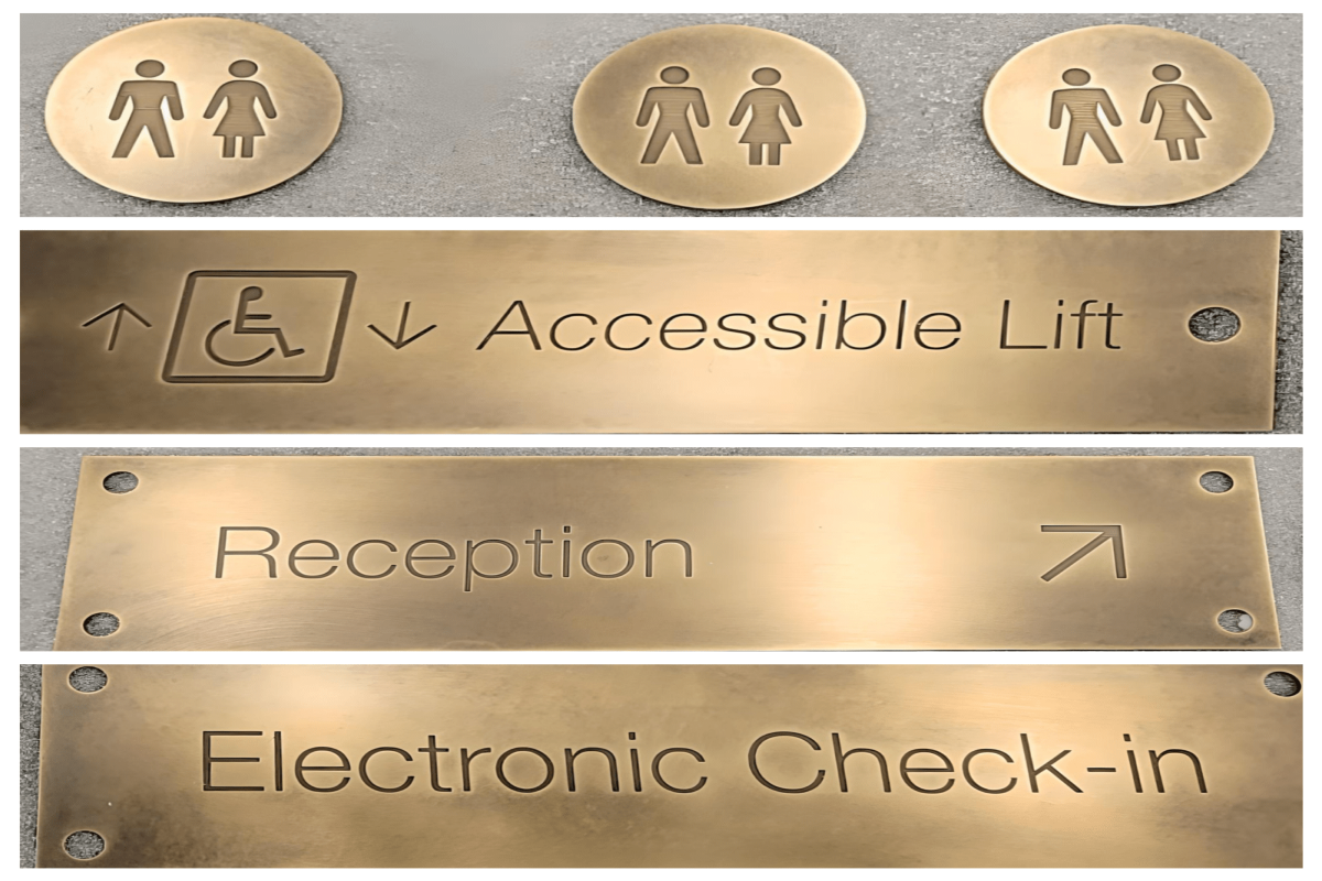 This collection of engraved antique brass wayfinding signs was created for a hotel project, covering essential elements such as reception, electronic check-in, accessible lift, staff-only areas, and WC signage. The antique brass finish provides a warm, timeless appearance that blends seamlessly with both modern and heritage interiors. Each sign is precision-engraved for clarity and durability, making aged brass an excellent choice for high-traffic environments where style and legibility matter.