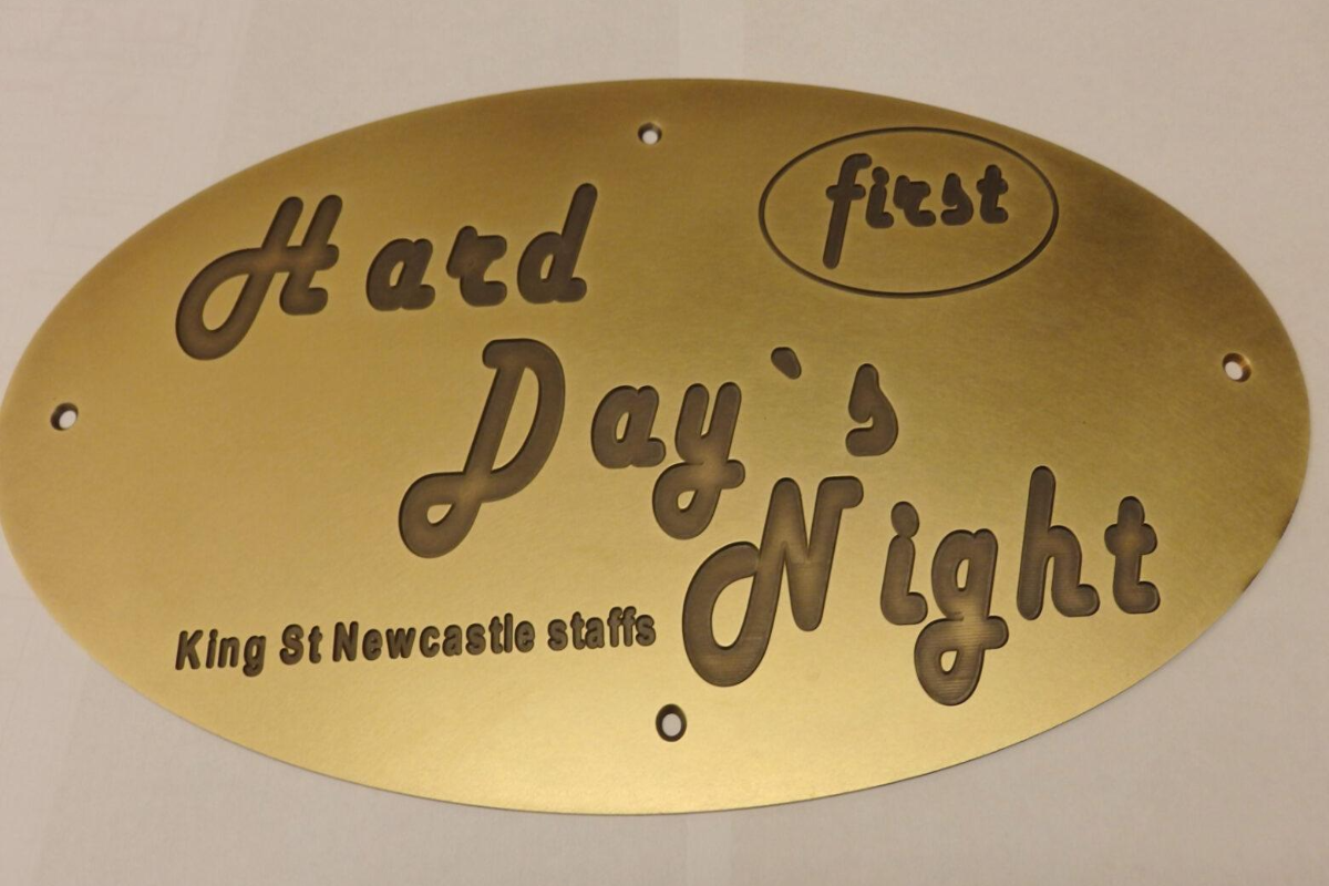 For the Hard Day’s Night pub restaurant in Newcastle-under-Lyme – a venue themed around The Beatles – Metal Sheets Ltd produced a custom brass name plate that captures the nostalgic atmosphere of the space. The plaque was engraved with precision and completed with an aged brass patina, offering a warm, vintage look that complements the interior design.