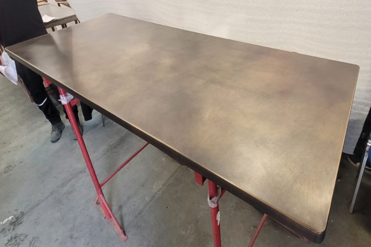 Metal Sheets Ltd are leading specialists in crafting bespoke brass table tops, backed by more than 15 years of expertise. Every brass table top is meticulously handcrafted to meet your unique requirements, whether you are a contract furnisher, a hospitality business such as a restaurant or hotel, or a private individual. We take pride in offering a wide variety of finishes, from elegant satin sheens to distinctive patinas, each created in our dedicated patina studio to ensure exceptional quality and aesthetic appeal. Our skilled team can create table tops in an array of shapes and sizes, with custom features including decorative studs and bull-nose edges, providing a truly one-of-a-kind design tailored to your needs.