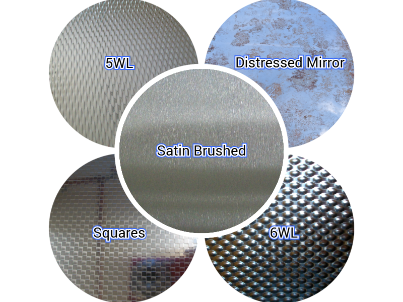 Popular options include Satin Brushed, 5WL and 6WL embossed finishes, Distressed Mirror for a vintage appearance, and Squares for a contemporary geometric texture. Each finish is produced to high standards in 304 or 316 stainless steel and can be fabricated to your required size and specification.